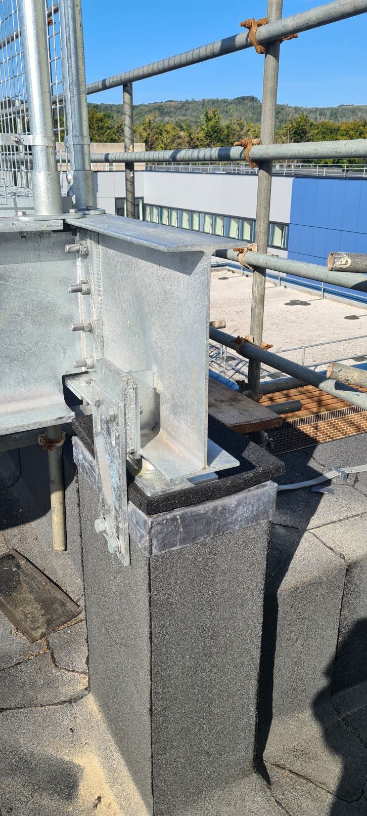 Description: New steel grillage designed for roof plant deck and internal room changes. The increased load from the new plant deck was checked against the wall and foundation capacity. Concrete stubs were used to raise the plant deck and spread the load on load bearing masonry.